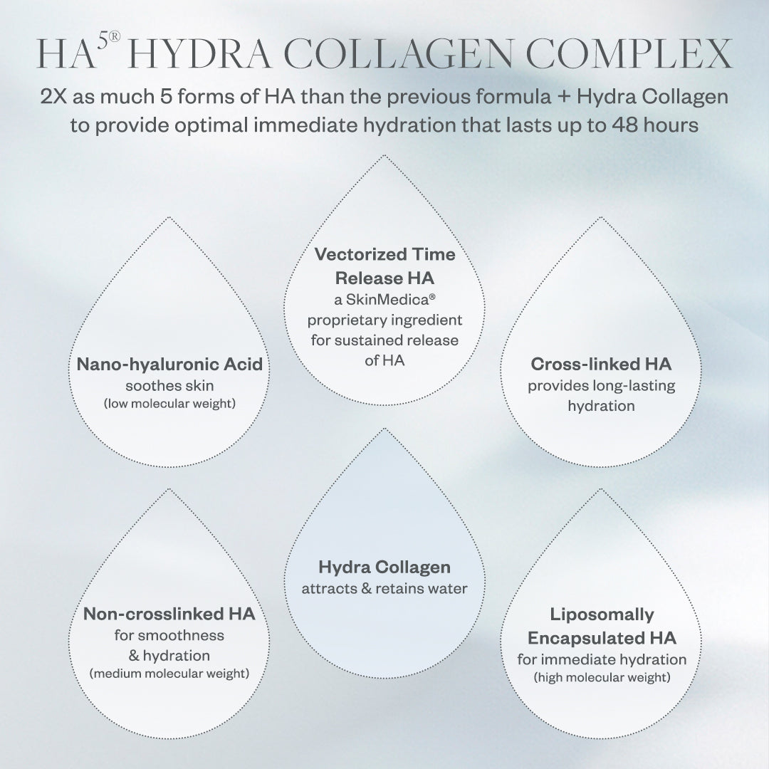- HA⁵® Hydra Collagen Replenish + Restore Hydrator attracts and retains water for instant hydration and visibly plump, smooth skin